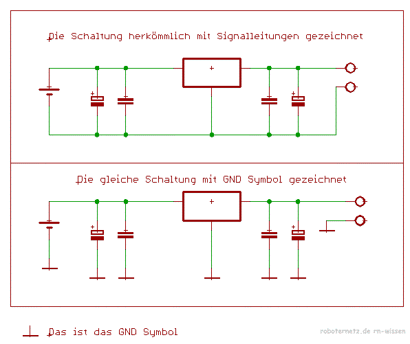 In Schaltplänen verwendet man oft ein GND-Symbol anstelle einer eingezeichneten GND-Leitung. Da GND sehr oft im Schaltplan vorkommt, möchte man dadurch die Übersicht erhöhen. Man muss sich immer vorstellen, dass alle GND-Symbole durch eine Leitung verbunden sind.