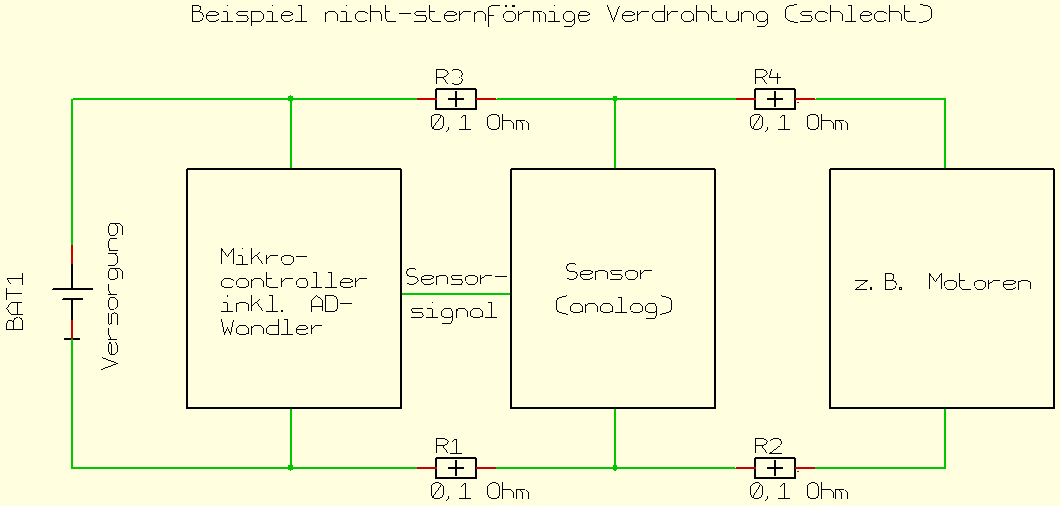 Im Bild ist eine exemplarische, sehr stark vereinfachte, schematische Darstellung der Verdrahtung einer Roboterelektronik gezeigt. Es sei hier in drei Blöcke Mikrocontroller, Sensorik und Motoren aufgeteilt. Es soll nun die Verfälschung von Sensorsignalen durch dieses Massekonzept gezeigt werden. Die 0,1-Ohm Widerstände sind Kabelwiderstände.