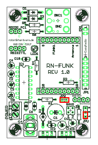 Wenn ein EasyRadio-Funkmodul eingesteckt ist, dann muß ein Jumper die Kontakte 2 und 3 kurzschließen. Im anderen Falle muß der Jumper 1 und 2 verbinden. Dies muß vor der Inbetriebnahme erfolgen, weil hiermit die Spannungsstabilisierung zwischen 3 und 5V umgeschaltet wird. |