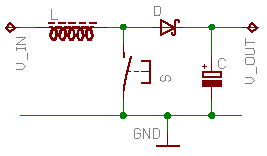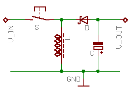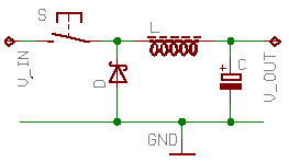 - Über S und die Drossel L fliesst Strom an der Diode D vorbei nach GND. Der Stromfluss baut ein Magnetfeld in der Drossel auf. In der On-Phase versorgt sich der Verbraucher aus dem Kondensator C. Erreicht der Strom durch die Drossel einen oberen Schwellwert, wird S geöffnet und die on-Phase endet.