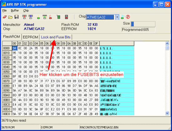 Nachdem man das Programm übertragen hat, muss man bei einem neuen Controller noch die sogenannten Fusebit´s umschalten. Unter dem Begriff Fusebit´s versteht man bestimmte Controllereinstellungen die ebenfalls über das ISP-Programmierkabel geändert werden können. Es gibt eine ganze Reihe von Einstellungen die man verändern kann, dies ist bei jedem Controller ein wenig anders. gewöhnlich reicht es jedoch den Quarz zu aktivieren und ein soganannten JTAG-Interface zu deaktivieren. Das JTAG-Interface ist ein spezielles Debugger-Interface um Programmfehler zu finden, es kann jedoch nur genutzt werden wenn man spezielle Zusatzhardware besitzt. Da dies selten der Fall ist kann man diese Port´s auch für andere Zwecke nutzen, daher wird dieses oft deaktiviert. Um die Fusebit´s nun zu ändern rufen wir im Programmierdialog die Tafel mit den Fusebits durch einen klick auf: