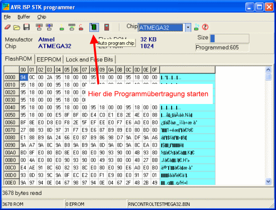 Vorsicht: Vor der Übertragung darauf achten dass die richtigen Quarzeinstellungen gewählt wurden. Man kann den Controller dort nämlich auch auf aktive externe Taktgeneratoren umstellen. Wenn man dies versehentlich tut und keinen echten Taktgenerator hat, dann ist der Controller quasi tot und muss gewechselt werden.