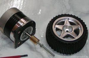 Potikupplungen gibt es bei vielen Anbietern (Conrad, Reichelt, robotikhardware usw.) für 6mm auf 6mm Achsen und 4mm auf 6mm Achsen. Da die meisten Motoren eine 6 mm Achse besitzen, ist dies also eine gute Lösung. Die Bilder zeigen wie ein Modellbaurad mit 4mm Loch an einem Motor mit 6mm Achse befestigt wird.