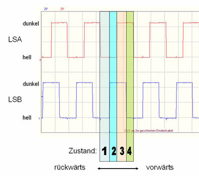 [[Bild:2LSZustand.jpg|400px|thumb|left|2 Lichtschranken (LSA und LSB) liefern phasenversetzte Rechtecksignale. In Vorwärts- und Rückwärtsrichtung ergeben sich unterschiedliche Zustandsfolgen]]