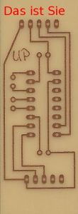 Bevor man damit beginnen kann eine Platine zu ätzen, benötigt man logischerweise eine Schaltung, die man auf seine Platine übertragen möchte. Diese kann man von Hand zeichnen, mit Paint zeichnen - oder man greift auf ein speziell dafür konzipiertes Programm wie zb. CadSoft Eagle zurück, welches im Rahmen der Light-Version kostenlos genutzt werden darf. Ein solches Layout könnte zum Beispiel so aussehen: Auf dem Bild ist in blau das Wort "UP" zu erkennen und das hat einen speziellen Grund: Da die ICs später von der Oberseite durch die Platine in die Schaltung eingefügt werden, muss die Schaltung spiegelverkehrt sein. Um zu gewährleisten, dass dies auch wirklich der Fall ist, sollte man vor dem Bedrucken der Folie ein Wort auf einer leeren Stelle des Layouts einfügen, denn sobald das Layout einmal auf der Folie ist und einem die Folie einmal runtergefallen ist, wird es schwieriger zu sagen wo oben und wo unten ist. Wenn man soweit ist, kann man das Layout auf seine Overheadfolie ausdrucken (Möglichst platzsparend vorgehen - die Folien sind nicht billig, aber man bekommt viele Layouts drauf).