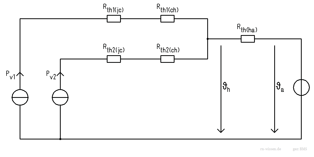 Thermisches Ersatzschaltbild: zwei Wärmequellen auf gemeinsamem Kühlkörper. Eigene Zeichnung.