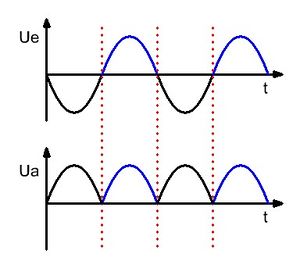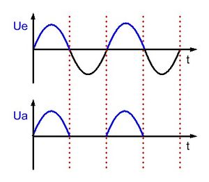 Bei der Einweggleichrichterschaltung wird nur eine Diode vor die Eingangsspannung geschaltet. Die Diode ist während der ersten Hälfte einer Halbwelle in Durchlassrichtung geschaltet, während der zweiten Hälfte sperrt sie. Dadurch wird erreicht, daß die negative Halbwelle wegfällt. Je nachdem, wie die Diode gepolt ist, wird eine positive oder eine negative Ausgangsspannung gleichgerichtet. Die Einweggleichrichterschaltung hat einen niedrigen Wirkungsgrad und eine hohe Restwelligkeit. Die Diode muss in Sperrichtung zudem für die Spitzenwerte der Eingangsspannung ausgelegt sein, bei kapazitiver Last für das doppelte.