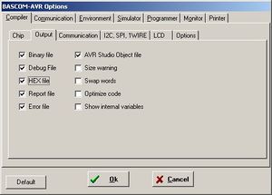 Für das Bascom-interne Programmiertool ist die Hex-Datei nicht zwingend notwendig, da dies mit der Binärdatei auskommt. Falls aber eine andere Anwendung dafür eingesetzt werden muss, gibt es in den Optionen (unter Compiler/Output) ein Auswahlfeld, das beim Compilieren eine Hex-Datei erzeugen lässt (standardmäßig schon ausgewählt). Andersherum, lassen sich mit dem Bascom Programmiertool auch anders erstellte HEX-Dateien zum µC übertragen.