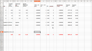 das Foto links entspricht ca. 36kHz (7DIV und 5.95 Perioden), daneben die dazu notwendigen Einstellungen am Oszilloskop, rechts der Anschluss des OSZI an der Senderplatine (Masse und Kollektor von Q2). Ganz rechts noch eine Tabelle, mit der ich die Frequenz berechnet habe: