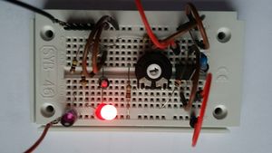 Der grundsätzlichen Kontrolle ob die Schaltung läuft dient die grüne LED (rote am Steckbrett), ob die IR-LEDs leuchten kann man letztendlich nur mit einer digitalen Kamera sehen.