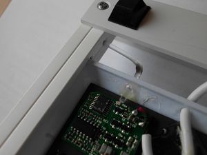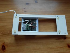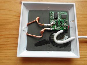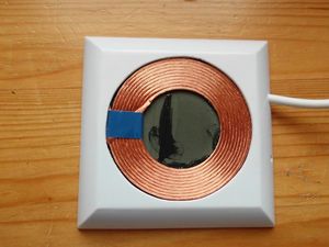 Die Spule selbst wurde mit einem 1mm dickem doppelseitigem Klebeband an den Ecken der Feritplatte ( Vorsicht – brüchig!) mit dem Gehäuse verklebt. Später habe ich festgestellt, dass die Spule nach einer gewissen Zeit (über Nacht) warm wird und dadurch das Klebeband an Haftung verliert, die Spule kippt dann teilweise nach unten und der Ladevorgang wird unterbrochen, da sollte man also noch etwas tun – richtig mit UHU-Plus Schnellfest (oder ähnlich) kleben.