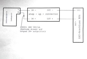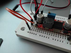 Bei den ersten Tests der Schaltung lief der Wandler nicht an. Die Versuche mit einem Graetz Gleichrichter brachten keine Besserung, ein – mehr oder weniger aus Verzweiflung - gemachter Versuch mit einer 1A Diode am Eingang des Wandlers brachte die Lösung. Der Wandler läuft nach dem einschalten der Ladestation nach ca. 5-10 Sekunden zuverlässig an. Hier der Wandler auf dem Steckbrett, rechts mit der SMD-Diode auf IN+ :