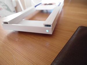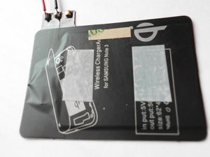 Die Ladeelektronik wurde auf der Rückseite der Feritplatte mit dem gleichen Klebeband an der Lötseite mit der Feritplatte verklebt, das Kabel an der Elektronik angeschlossen. Plus und Minus an der Elektronik sind nicht gekennzeichnet, Vorsicht beim Anschluss des (evtl. gekürzten) USB-Kabels, Lage von rot und schwarz merken! Das Kabel habe ich mit UHU Plus angeklebt (Zugentlastung). Am anderen Ende des USB-Kabels ist ein USB-Steckernetzteil mit einem Ausgangsstrom von 1A. PC-USB Anschluss hat von der Leistung her nicht gereicht.