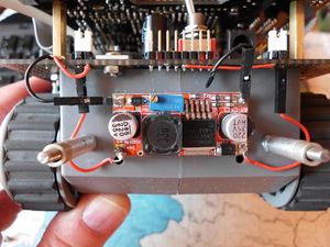Die Spule ist an der Bodenwanne im vorderen Bereich mit dünnem Doppelseitigem Klebeband mittig zur Wanne des RP6 aufgeklebt (möglichst etwas weniger schief als hier), die Kabel sind mit einem tropfen Kleber fixiert