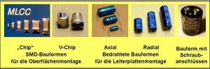 Daneben finden sich aber auch immer noch Bauformen für speziellen Anforderungen, z.B. Flachband- oder Schraubanschlüsse für Hochstromanwendungen oder Durchführungskondensatoren im HF-/UHF-Bereich.