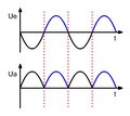 Aus den mathematischen Grundlagen folgt, dass bei einer sinusförmigen Spannung der Strom einen cosinusförmigen Verlauf mit der gleichen Frequenz wie die Spannung besitzt. Der Strom ist durch die Cosinus-Funktion um 90° phasenverschoben, d.h. er eilt der Spannung mit einer Phasenverschiebung von 1/4 Periode voraus (eine Spannung kann am Kondensator also nur anliegen, wenn vorher Strom in ihn geflossen ist).
