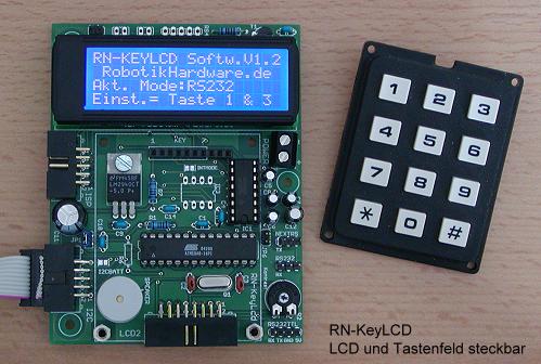 Ein LCD und eine Tastatur ist fast bei allen Microcontroller-Anwendungen und Robotik-Basteleien von großem Vorteil. Nicht nur bei der späteren Bedienung der Schaltung sondern auch beim Debuggen eigener Controlleranwendungen. Der Nachteil war immer das ein Standard-LCD als auch eine Matrixtastatur viele Portleitungen belegt. Damit macht dieses Board nun Schluß! Das Board belegt keinerlei zusätzlichen Port, es kann sowohl über eine RS232 Schnittstelle (PC V24 Norm oder TTL Pegel) als auch I2C-Bus oder sogar RS485 angesteuert werden. Der Anschluß und die Ansteuerung wird dadurch sehr einfach, nicht nur bei allen RN-Board´s. Baudraten, I2C-Slave-Adresse und Betriebsmodus können über das Tastenfeld einfach umgeschaltet werden. Der Modus bleibt auch bei Spannungsausfall erhalten!