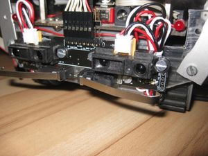 - Zwei durch Transistor abschaltbare Sharp-GP2Dxx- oder Radar-Abstandssensoren (analog) oder zwei SRF02-Sensoren (digital via I2C)