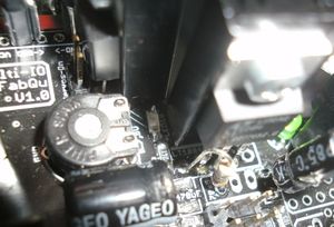 Beim Einlöten darauf achten, dass der GND-Pin des Reglers nicht zu dicht am Vorwiderstand der Servo-LED (R25) sitzt, um hier Kurzschlüsse zu vermeiden.