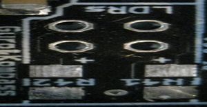 - An den vorbereiteten Spannungsteilern "LDR" ist ein Kondensator falsch beschriftet: Nicht C42 ist richtig, sondern C27, ein 1206er 100nF-Kondensator. Auch ist es hier besser, die 100nF-Kondensatoren auf der Oberseite zu verlöten (dort, wo die beiden Widerstände R41 und R42 sitzen) und diese beiden Widerstände an die Kondensatorplätze auf der Unterseite zu verlöten. Denn bei voll bestückter Platine wird es nachträglich schwierig, die Widerstände ein- oder umzulöten.