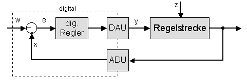 Im digitalen Regelkreis wird der Istwert x vom Tachogenerator mit einem A/D-Wandler digitalisiert. Der Sollwert w wird dem µC als digitaler Wert übergeben. Die Stellgröße y entspricht dem PWM-Wert für den Motortreiber. Um zum analogen Regler vergleichbar zu sein, wurde sowohl für den A/D-Wandler als auch für den PWM-Steller eine 8-Bit-Breite vorgesehen. Damit ist die Verstärkung in beiden Fällen gleich und analoger und digitaler Regler besser vergleichbar.