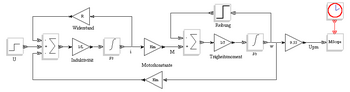 Als Störgröße können unterschiedliche Reibwerte oder Steigung und Gefälle rückwirkend über das Getriebe die Drehzahl beeinflussen. Das Getriebe und die Last sind zwar außerhalb der Regelschleife, beeinflussen aber durch die feste Kopplung des Getriebes die Dynamik des Regelkreises. Durch die starre Kopplung kann das Trägheitsmoment des Motors und die Masse des Fahrzeugs zusammengefasst werden. Das Gleiche gilt auch für die Reibwerte. Damit vereinfacht sich die Modellierung und das Blockschaltbild reduziert sich auf folgende Schaltung: