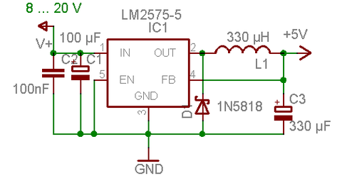 Beispiel für eine Dimensionierung des Filters (lt.Datenblatt des LM2576-5): 20µH, 100µF