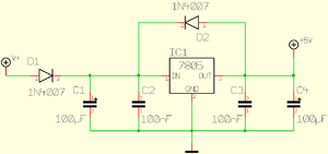 Die wohl bekanntesten und sehr häufig eingesetzten Spannungsregler sind die der 78xx-Serie. Das xx steht hierbei für die Spannung, die die Regler erzeugen: 7805 für 5V, 7812 für 12V, und so weiter. Der große Vorteil dieser Regler ist ihr geringer Preis (ab etwa 20 Cent) und die einfache Verwendung: in der Minimalvariante sind keine externen, zusätzlichen Bauteile nötig. Es wird aber trotzdem dringend empfohlen, zwei Kondensatoren anzuschließen, damit der Regler stabil arbeitet.Die Regler vergleichen die Ausgangsspannung mit einer intern erzeugen Referenzspannung. Wenn die Ausgangsspannung zu niedrig ist, wird ein Transistor, durch den der Ausgangsstrom fließt, stärker angesteuert, sodass ein größerer Strom fließen kann, bis die gewünschte Spannung erreicht ist.