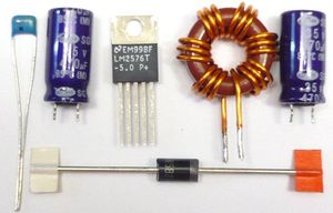 - Der Ausgangselko sollte einen geringen ESR ("equivalent series resistance") und einen ausreichenden maximalen Ripplestrom (in der Regel für 100kHz angegeben) haben. Es gibt spezielle Low-ESR Typen, die für solche Anwendungen verwendet werden können. Alternativ kann durch eine Parallelschaltung von mehreren Elkos ebenfalls ein geringer ESR erreicht werden. Ist der ESR jedoch zu gering, kann es zu Regelschwingungen kommen. Auch hierfür gibt es Hinweise der IC-Hersteller.